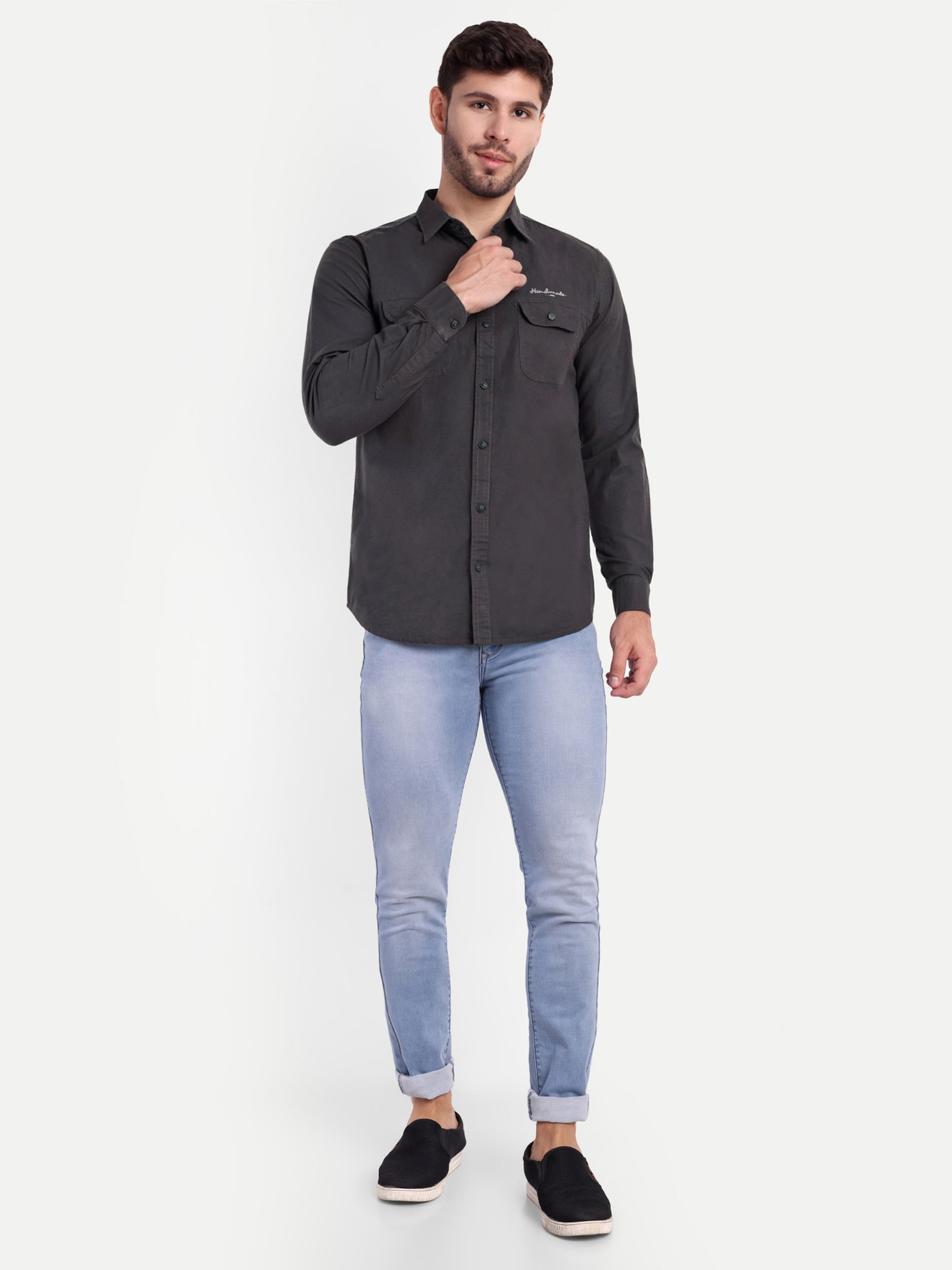 Embrace sophistication with our Dulquer collection. Tailored to perfection, this shirt exudes refined charm and impeccable craftsmanship. Product Details: Color: Dark Grey Pattern: Solid Double Pocket Fit: Trim Fit Occasion: Casual Wash Care: Machine wash...